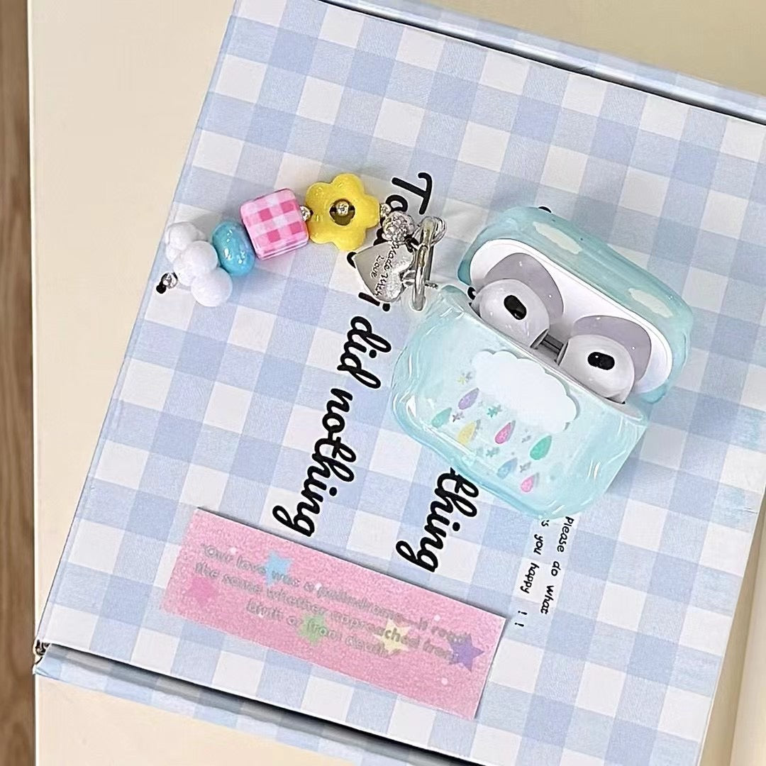Bring a little sunshine to rainy days with this Blue Cloud AirPods Case, featuring a soft sky-blue design with cute cloud and rainbow raindrop details. The case includes a colorful beaded charm that adds a playful and aesthetic touch — perfect for anyone who loves cheerful, pastel accessories.