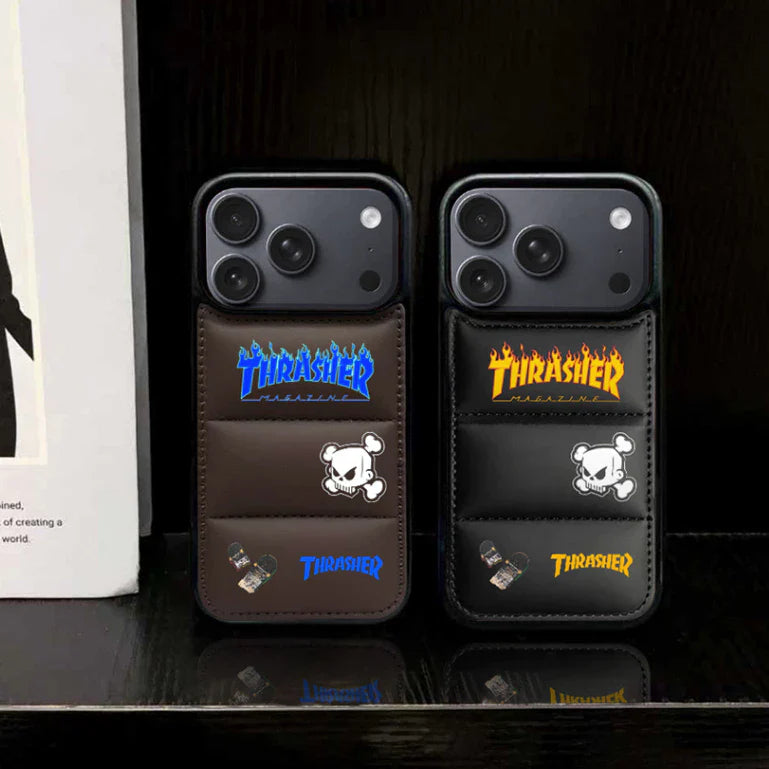 Ett djärvt vadderat pufferfodral med en ren läderliknande finish och skateinspirerad flammgrafik. Mjukt att hålla i, tillräckligt tåligt för vardagliga droppar och perfekt för alla som älskar en streetwear-känsla.